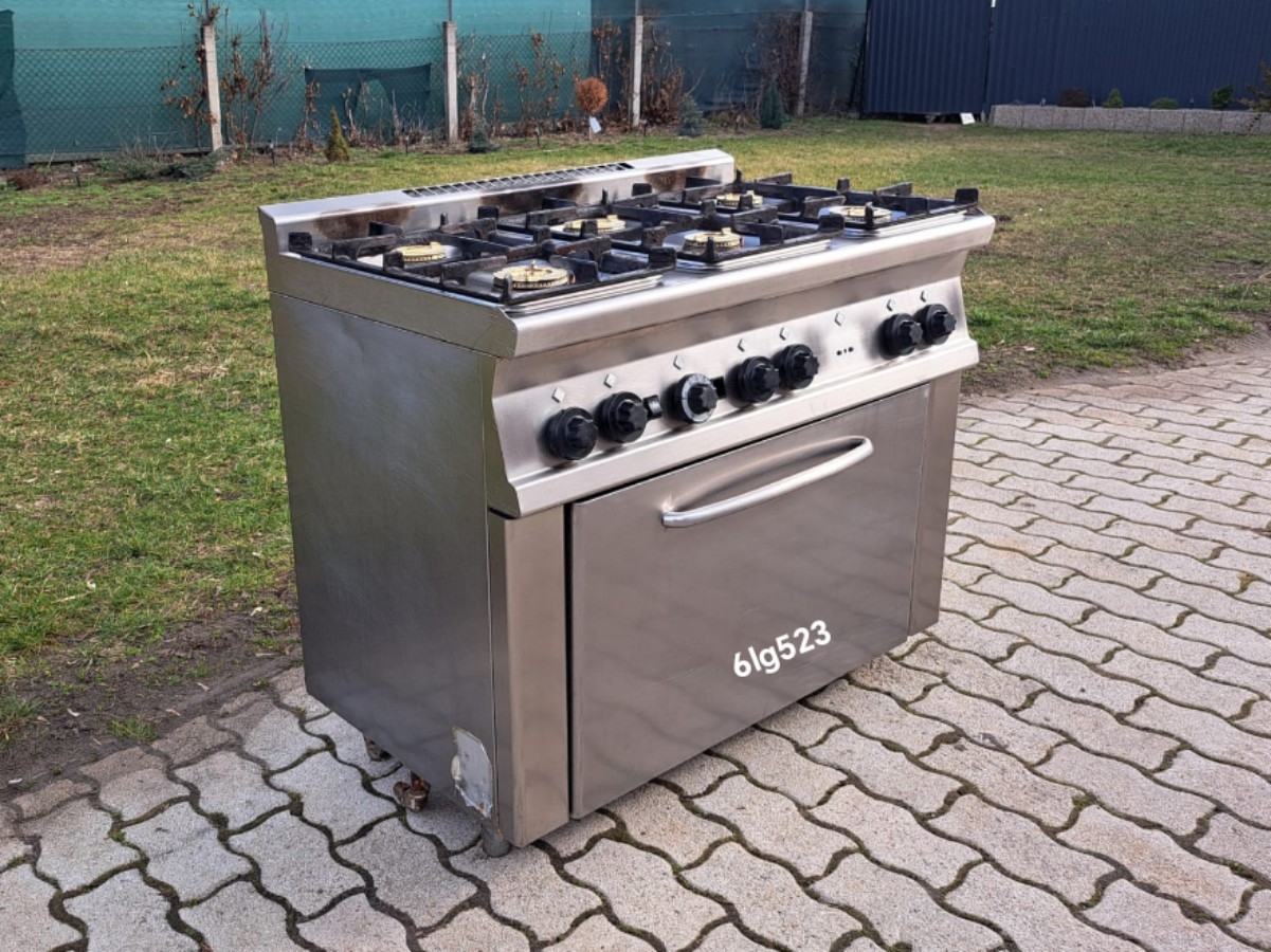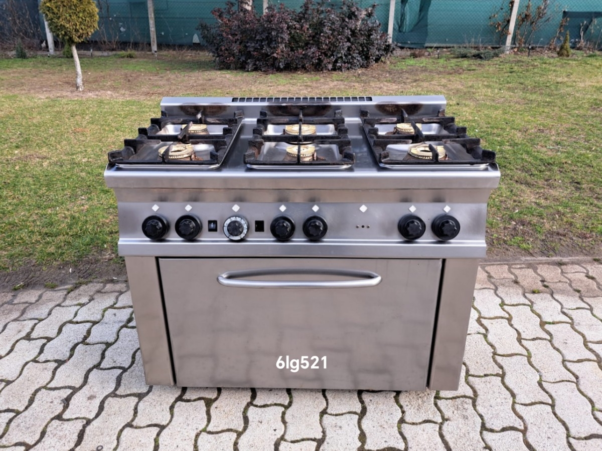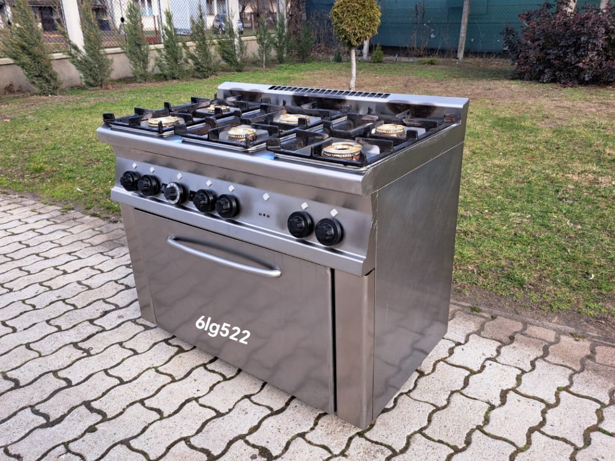 Ipari 6 égős gáztűzhely – 6lg52 Kialakítás: alul gázos sütővel Teljesítmény: 2 x 6,5 kW + 2 x 5,5 kW + 2 x 5 kW égővel Földgázról üzemel Mérete: 100 x 60 x 89 cm Ára: 359.000,- Ft
