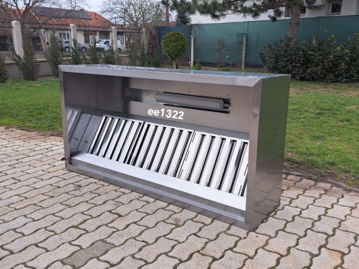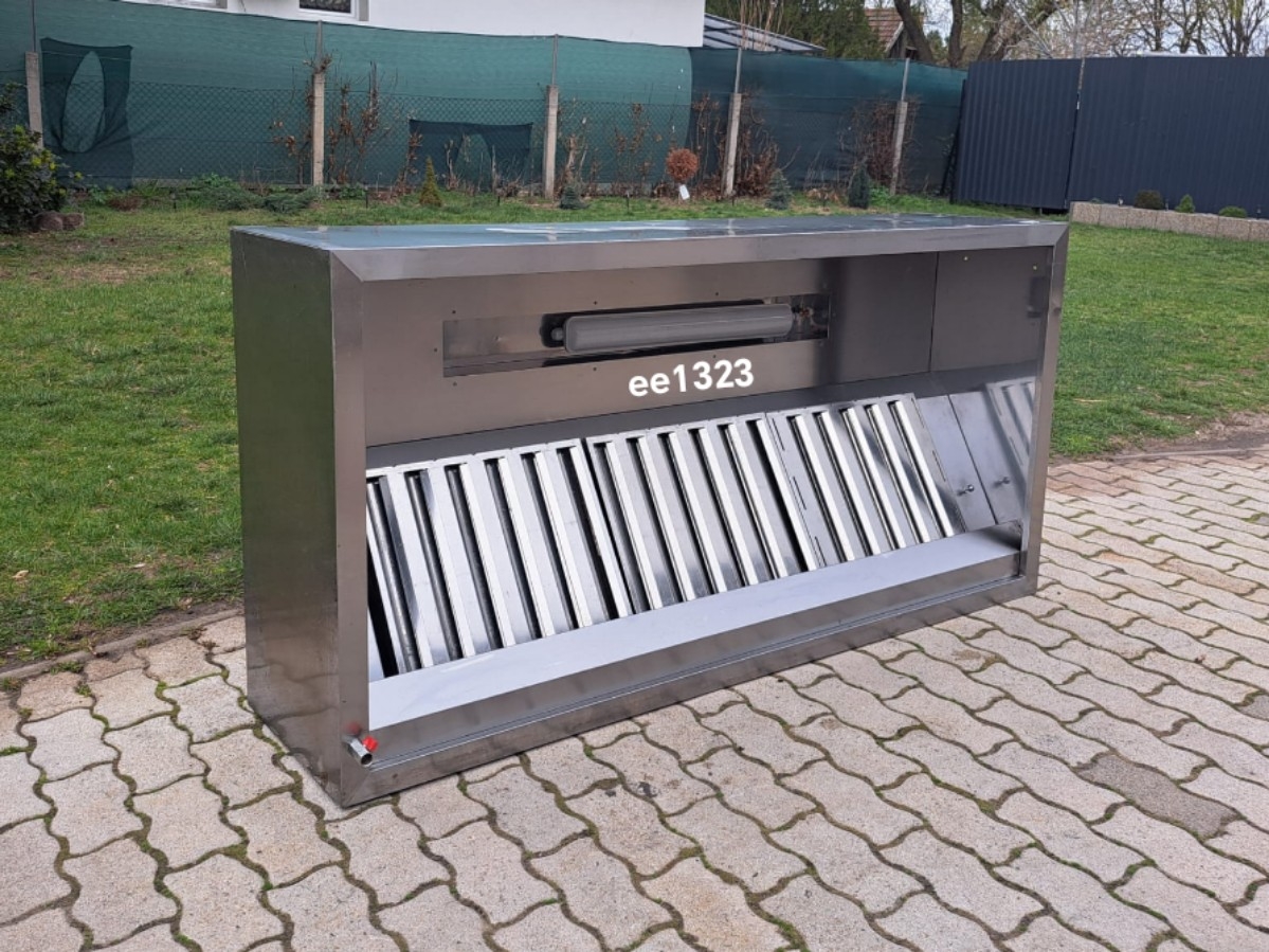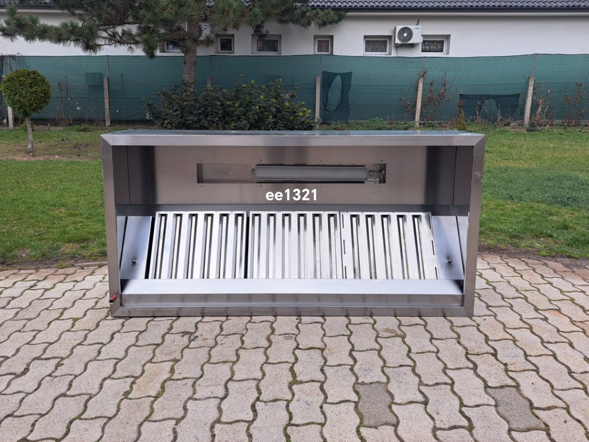 Ipari rozsdamentes elszívóernyő – ee132 3 db labirint szűrővel Motor nélkül Termék mérete: 180 x 80 x 45 cm Ára: 179.000,- Ft