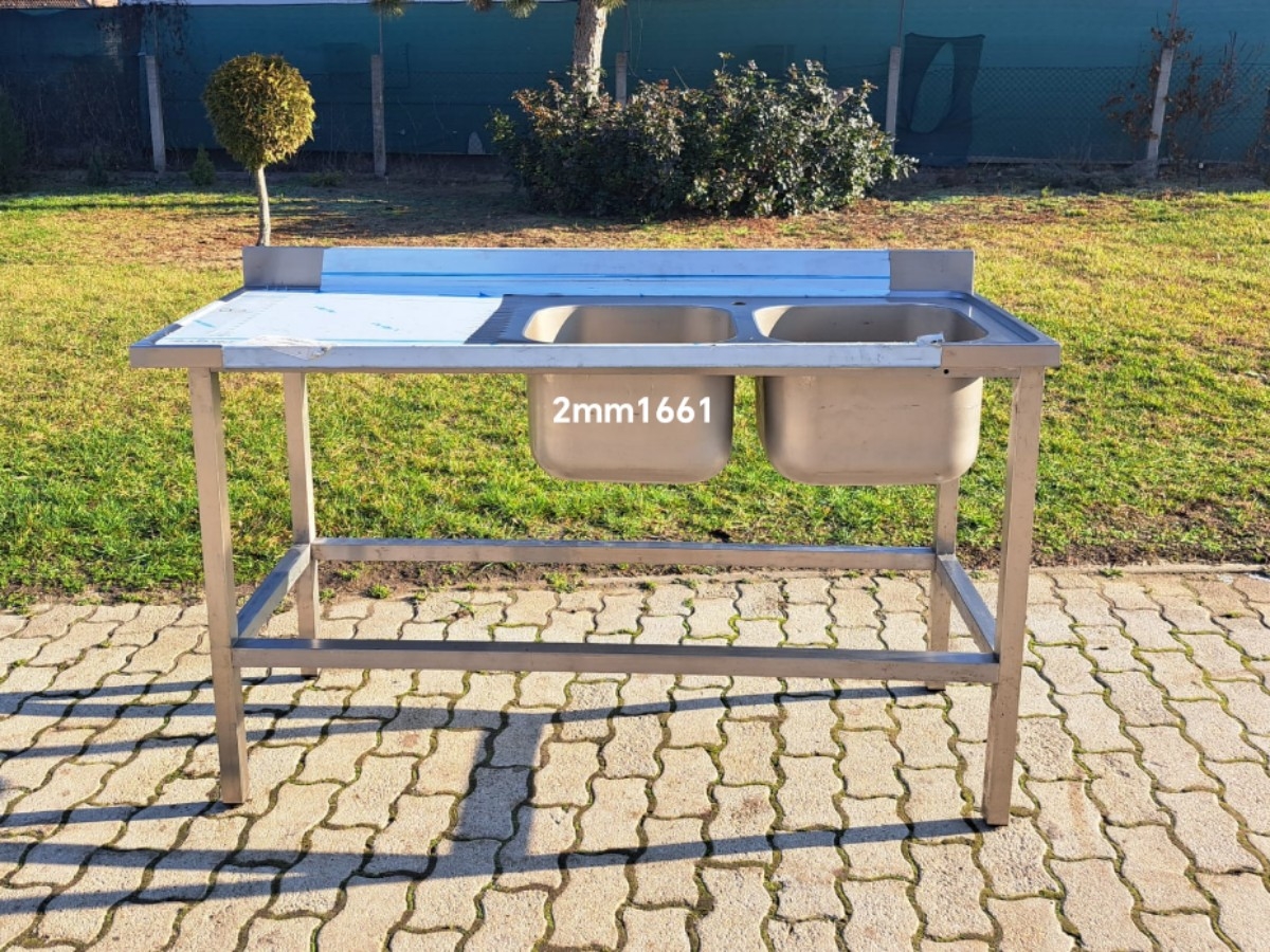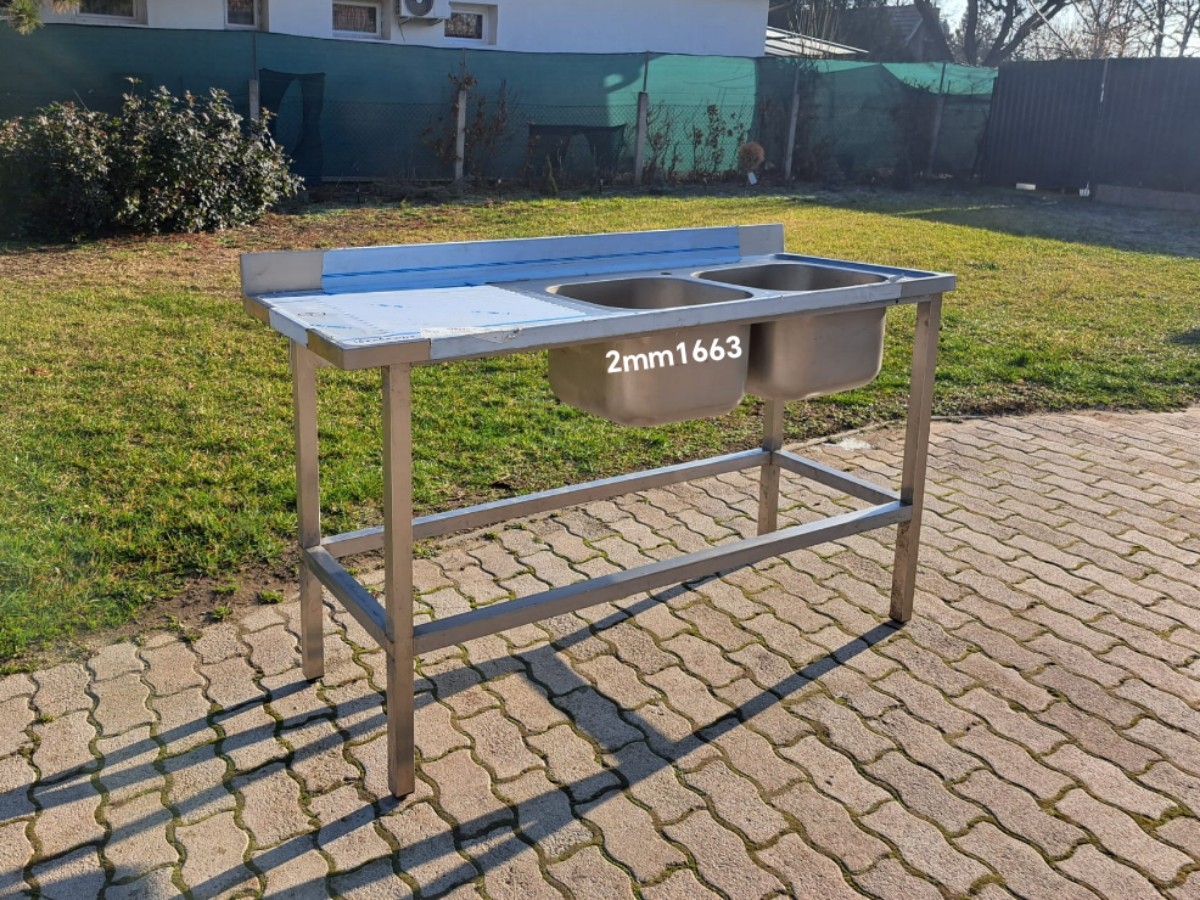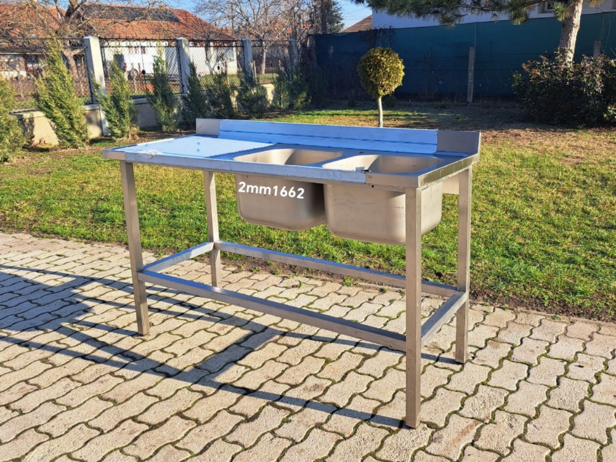 Ipari rozsdamentes mosogató – 2mm166 2 medencés, oldalt csepegtetővel, hátsó felhajtással Medence mérete: 40 x 40 x 30 cm Külső mérete: 160 x 60 x 89 cm Ára: 159.000,- Ft
